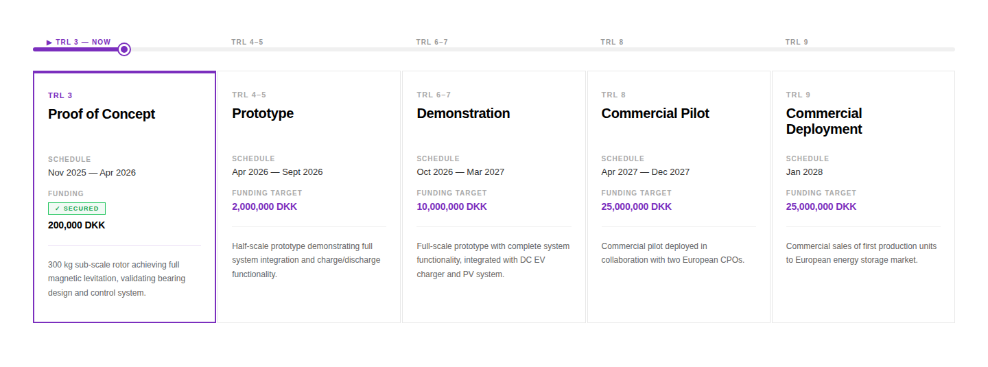 The Mk1 PoC isolates and validates the most technically challenging component of a FESS: the magnetic bearing system. A 300 kg sub-scale rotor demonstrates full magnetic levitation — proving the bearing architecture before committing to full-scale fabrication. Built for €20,000 — including machined components, control electronics, and instrumentation.